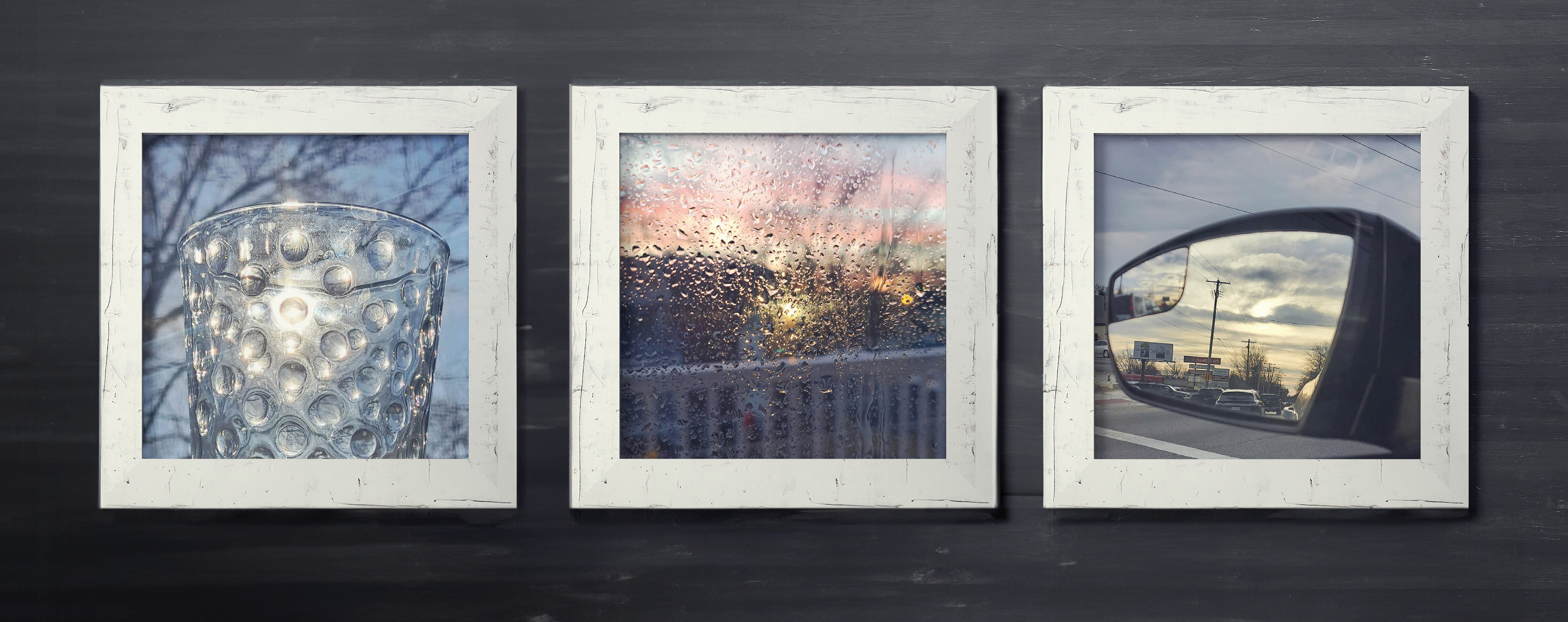 Each photograph presents a distinct perspective: the patterned clarity of a textured glass, the blurred vibrance of a rainy window, and the layered reality within a car’s side mirror. These moments highlight the often-overlooked beauty in transitional spaces between inside and outside, clarity and distortion.