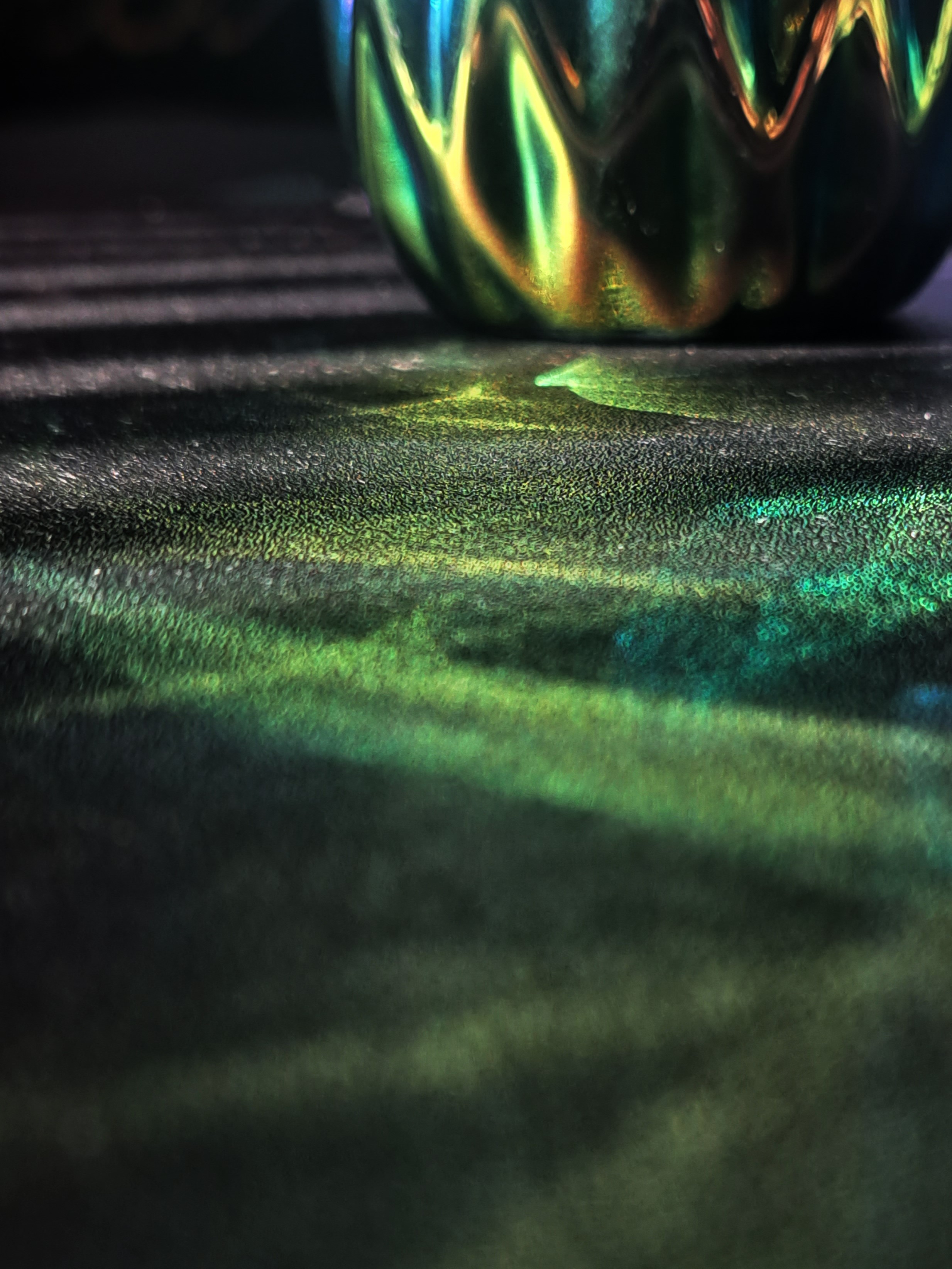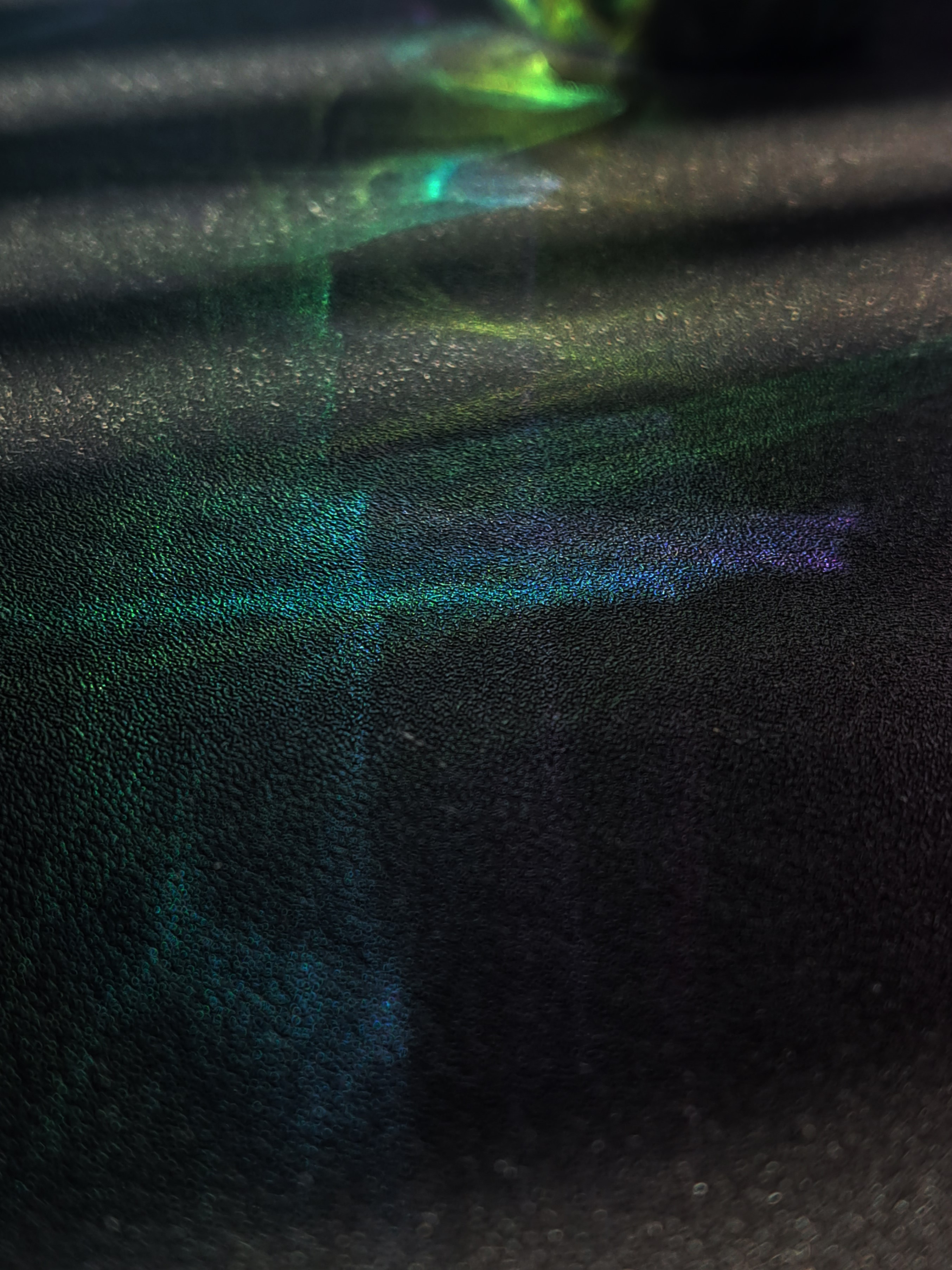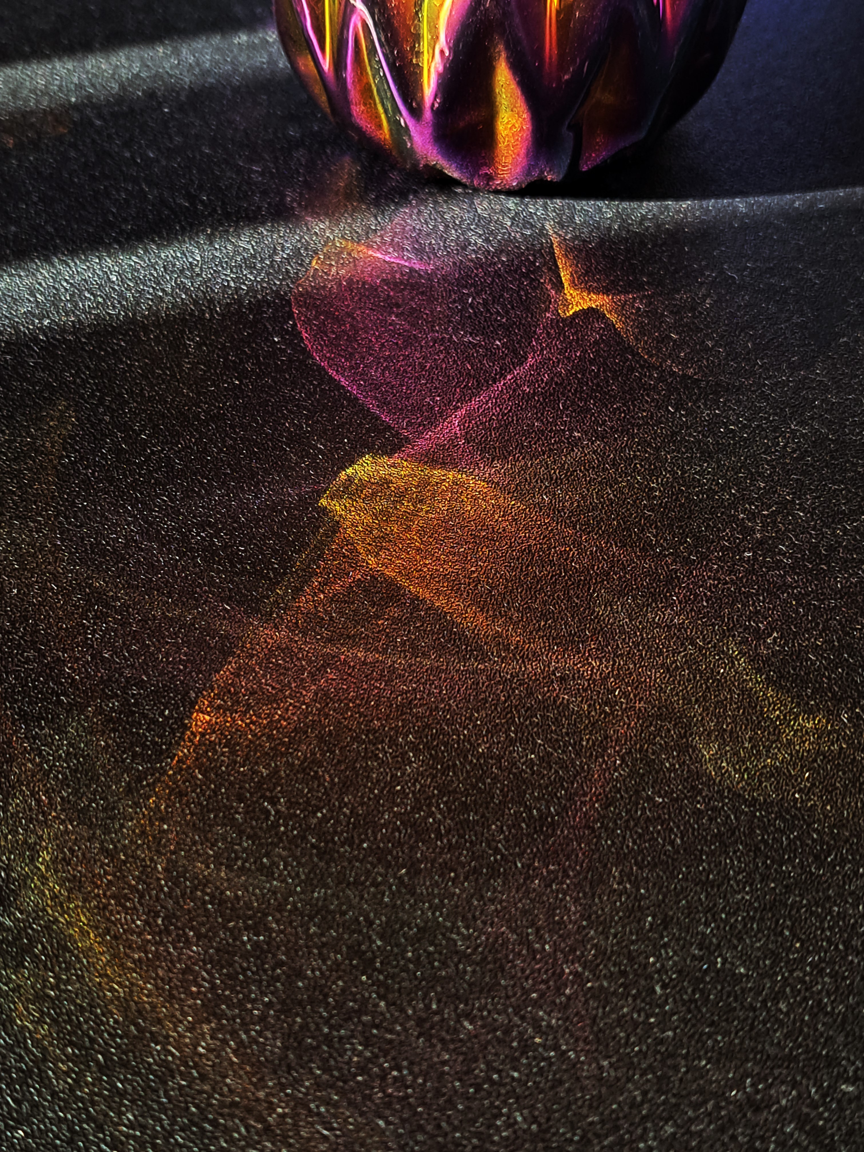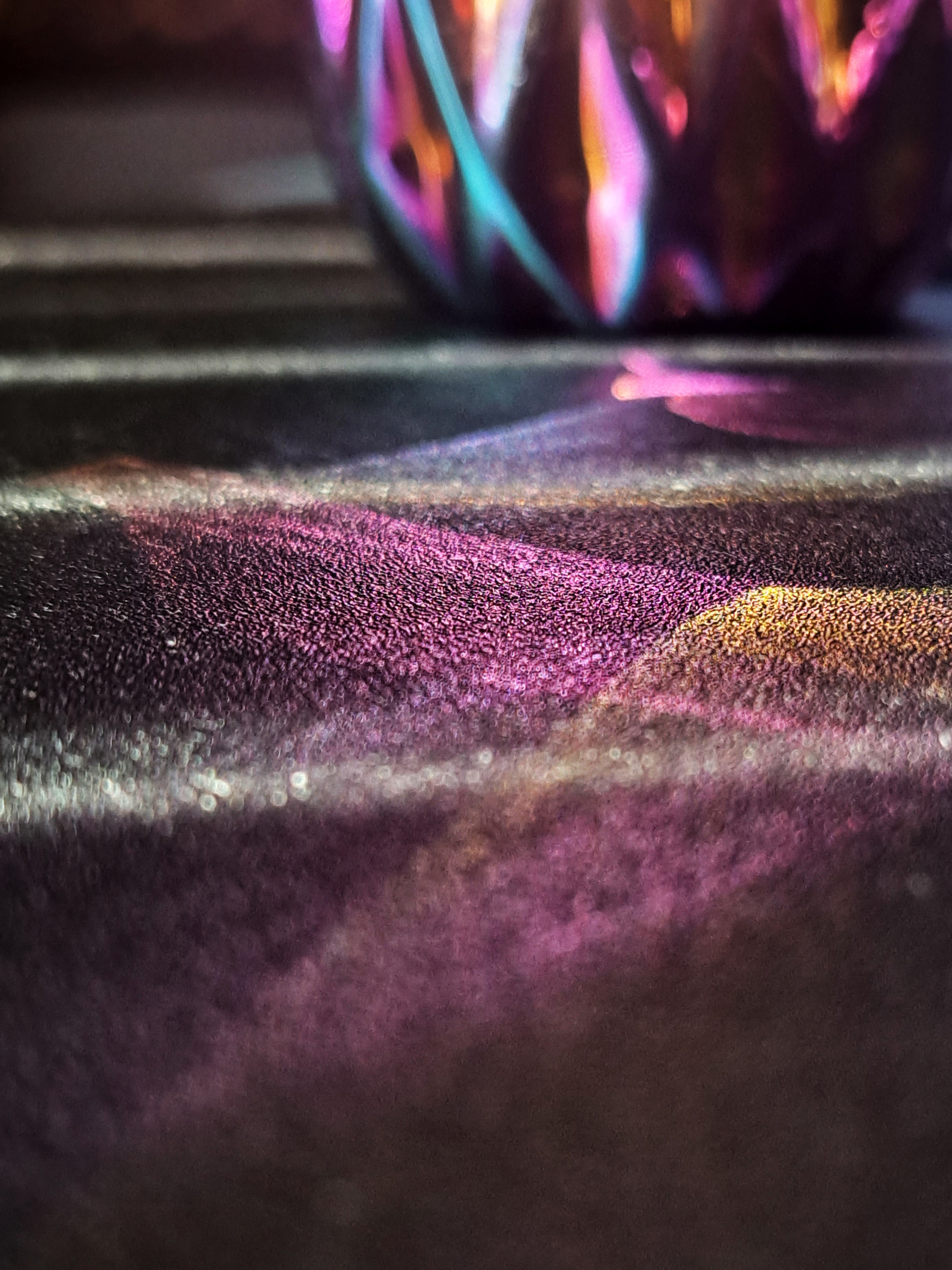 This photography series explores how light and color interact in everyday objects. It focuses on an iridescent color pencil holder with rhombus shapes. When sunlight hits the holder, it creates colorful reflections and patterns on a black table.