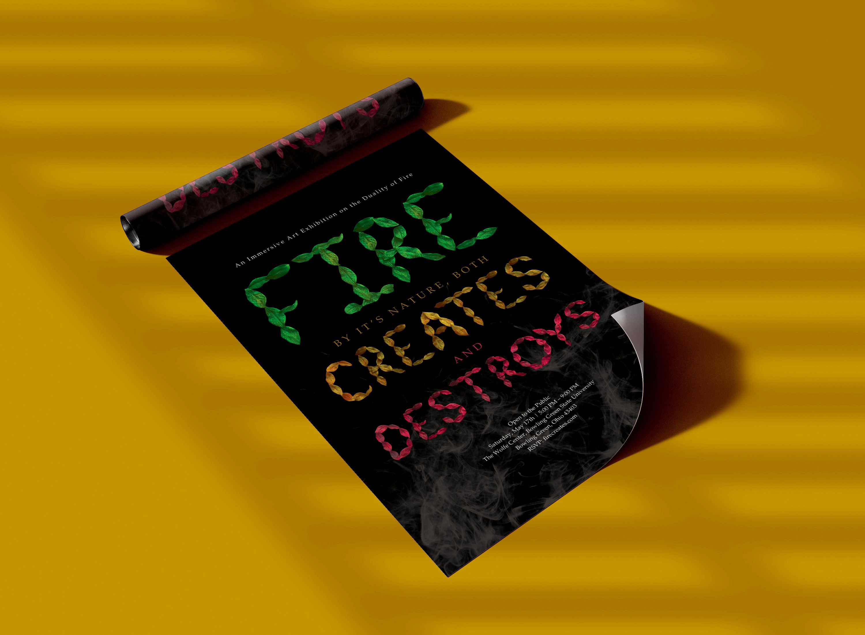 The “Fire” event poster explores the idea that fire can both create and destroy. A custom typeface was designed using the real leaves of Burning Bush to form the letterforms. The colors and textures express the dual nature of fire, its ability to bring life as well as cause destruction. The poster captures the dramatic and transformative essence of fire while connecting it back to the natural world.