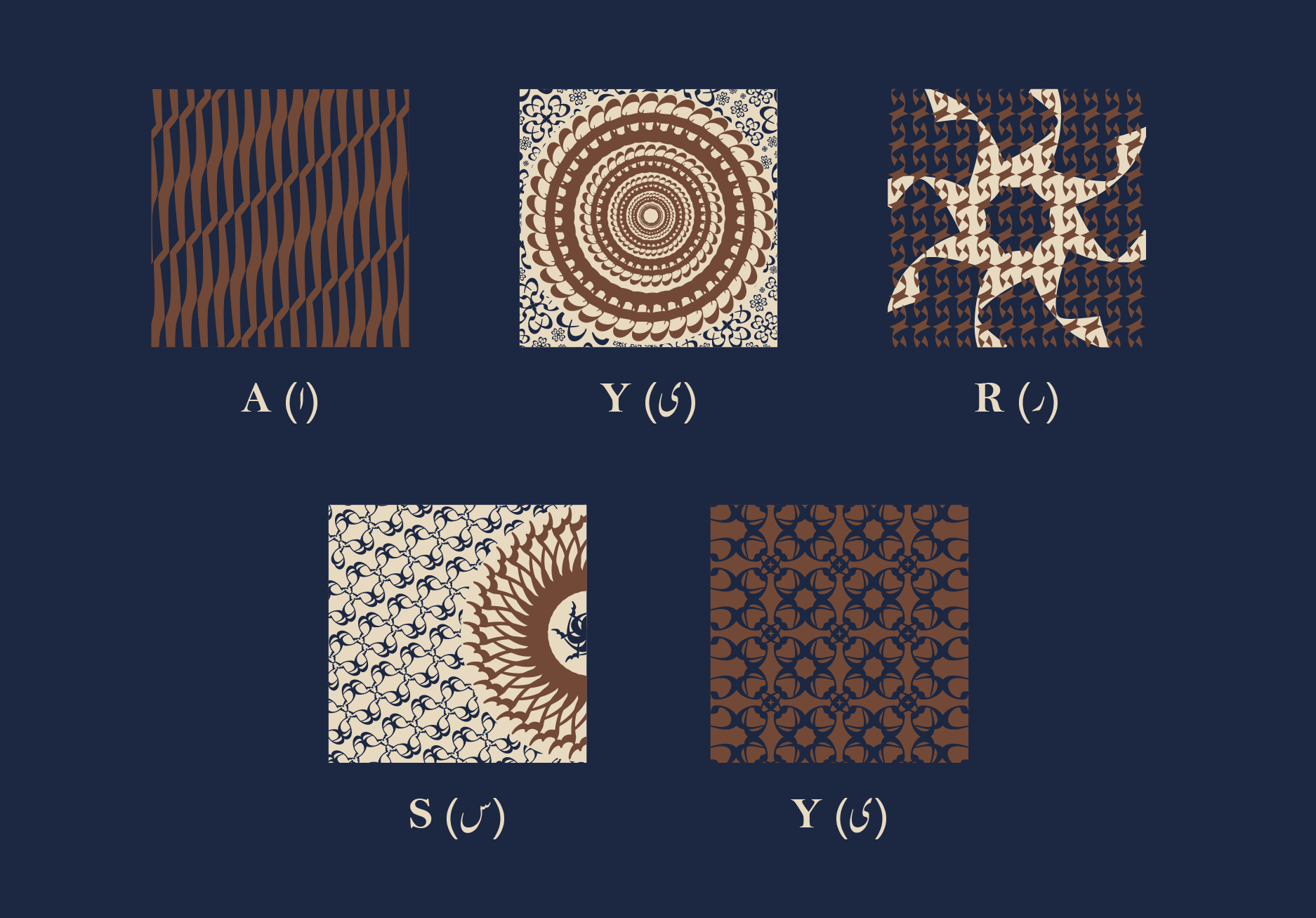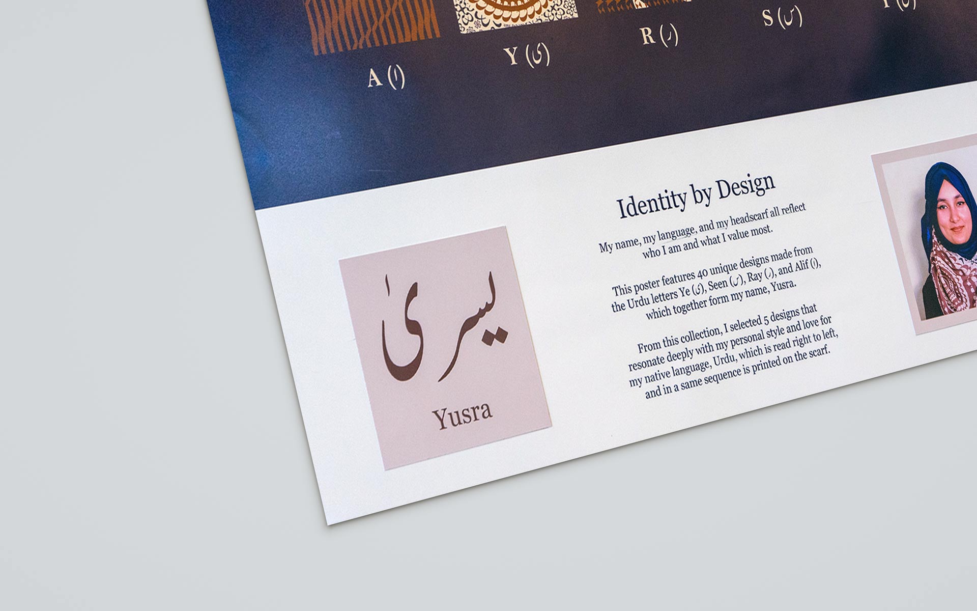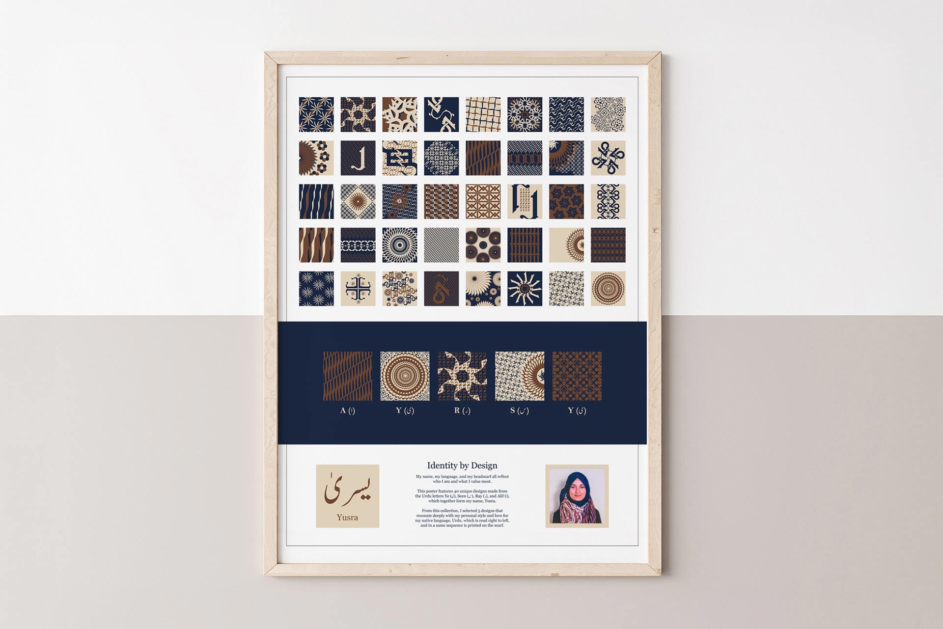 To make the project even more personal, I focused on the four Urdu letters that spell my name: Ye (ی), Seen (س), Ray (ر), and Alif (ا). I designed 10 variations for each letter, creating a library of 40 designs. From these, five designs were printed in the sequence of my name, following Urdu’s right-to-left flow.