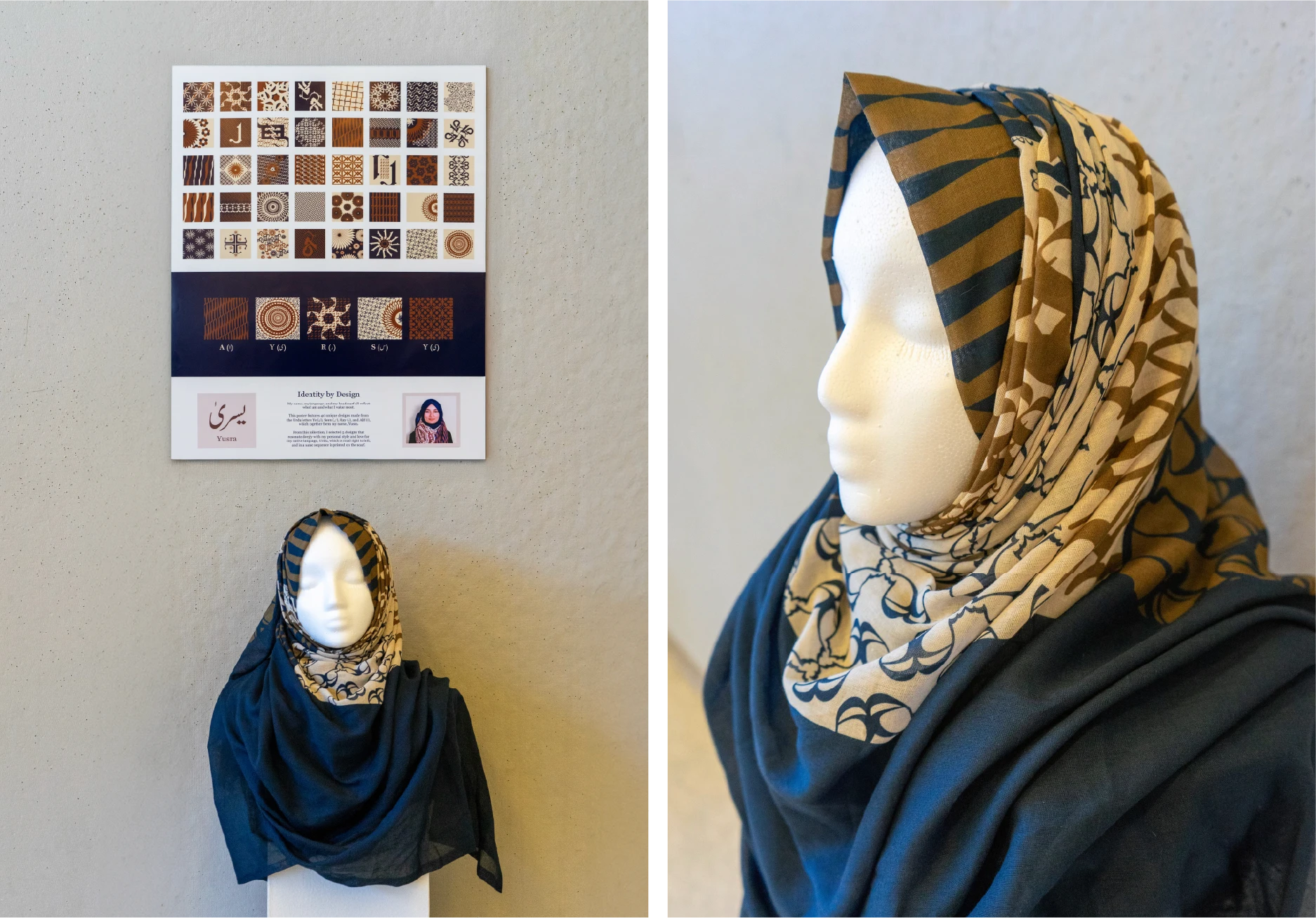 Color also played a key role in capturing my identity. I chose a palette of navy blue, brown, and beige, colors that reflect my personality and everyday style. To tie the project to my clothing identity, I printed the final designs on a scarf, honoring the fact that I wear a hijab as part of my daily life.